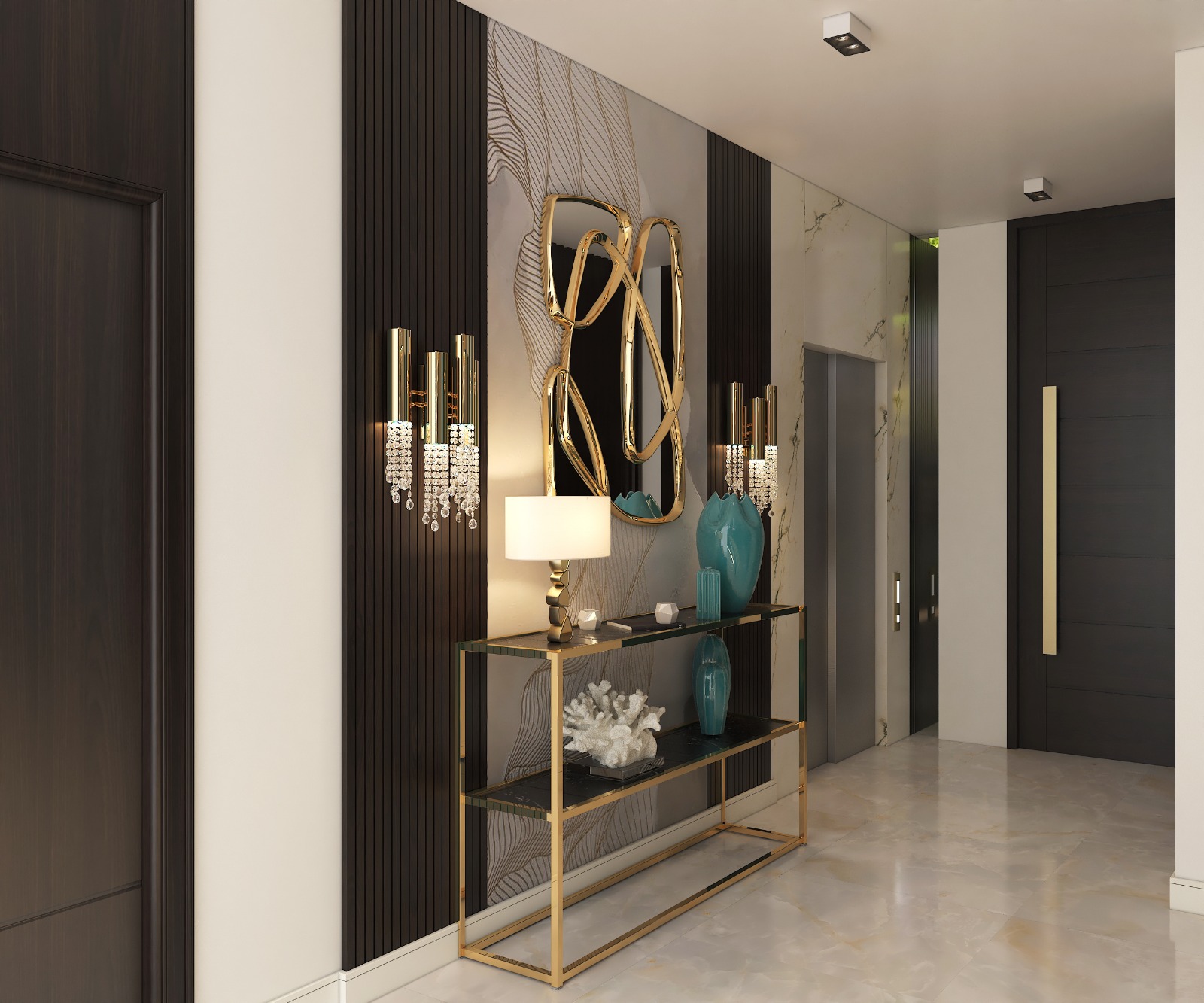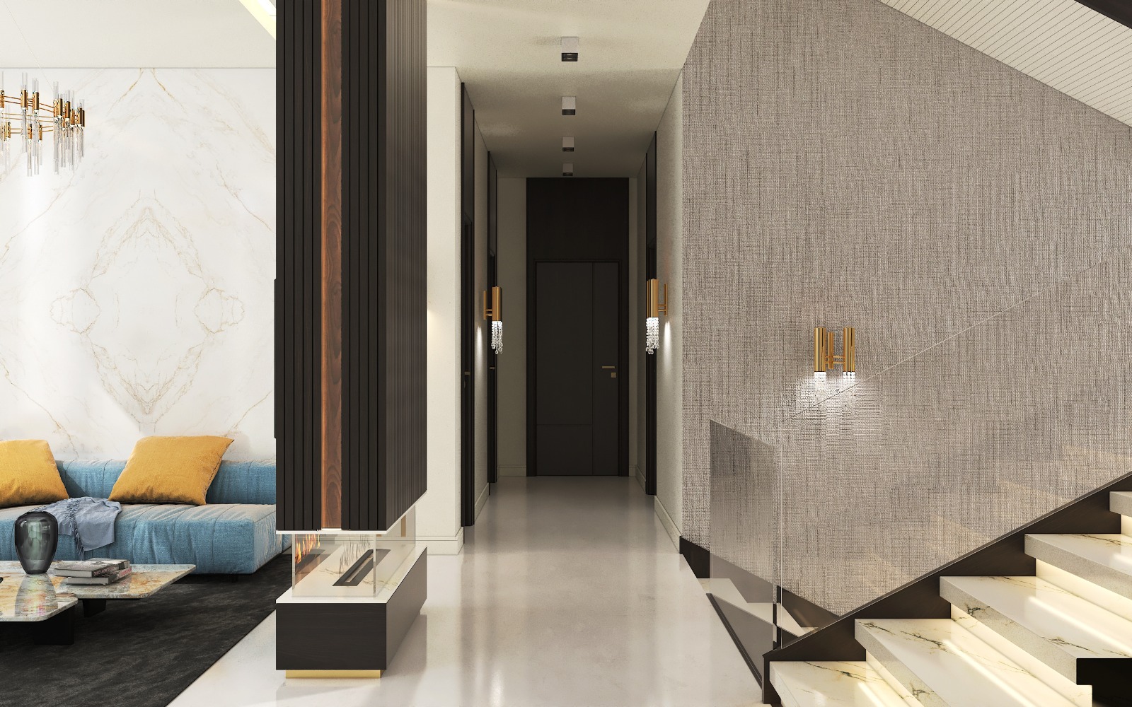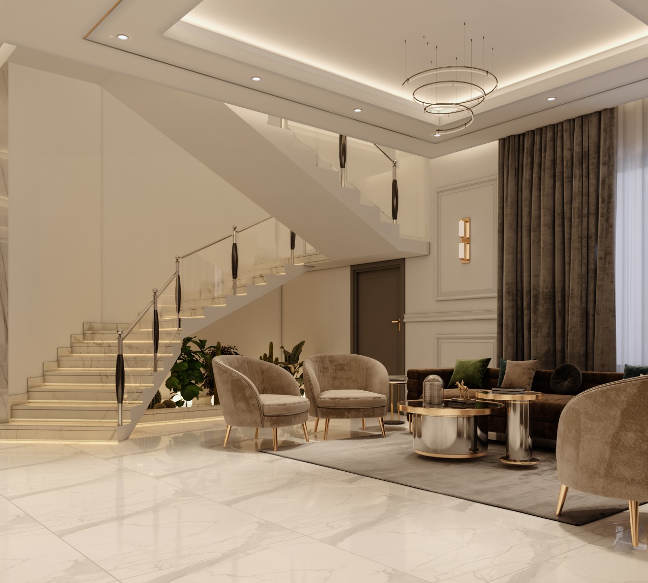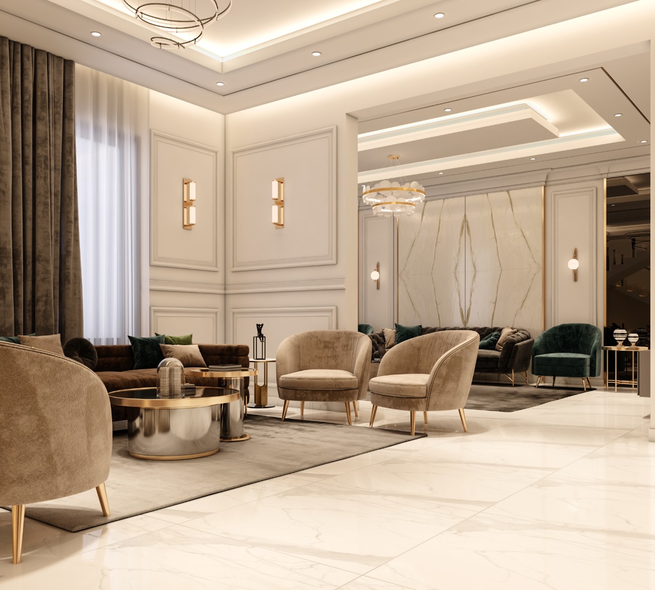 مشروع تصميم وتشطيب فيلا سكنية متكاملة بمنطقة الشيخ زايد بخامات فاخرة عالية الجودة. يشمل المشروع تأسيسات كاملة للصحي والكهرباء والتكييف، تشطيبات راقية بجبس مستورد، تجليد حوائط بألواح خشبية داكنة ورخام طبيعي بعروق ذهبية، أرضيات رخام لامع فاتح، أعمال سيكوريت، وإضاءة فاخرة من الكريستال. التصميم يعتمد على أسلوب فندقي عصري بتفاصيل معمارية دقيقة مع أثاث وفرش كامل لجميع المساحات والغرف.