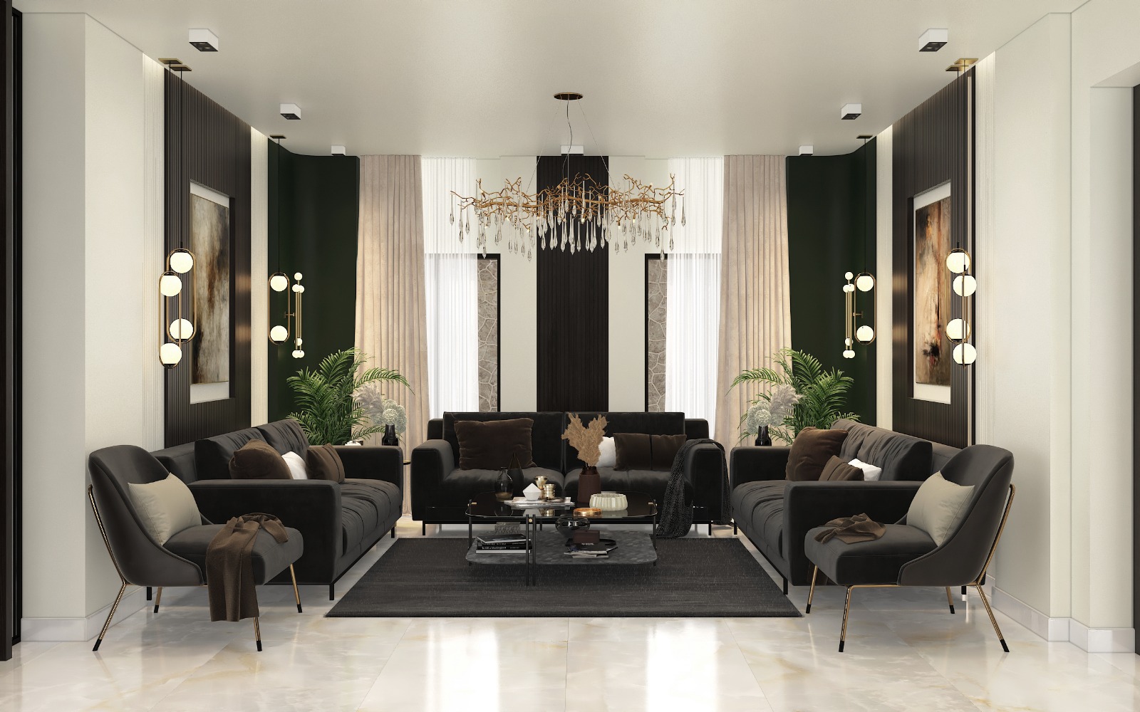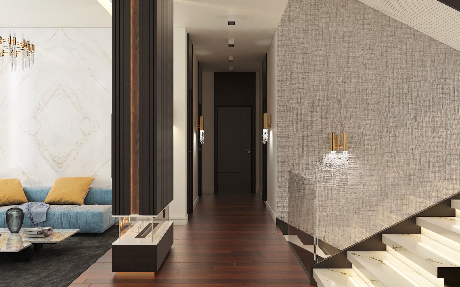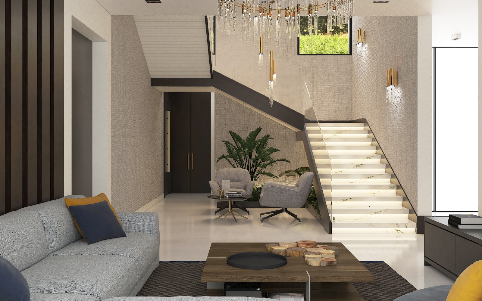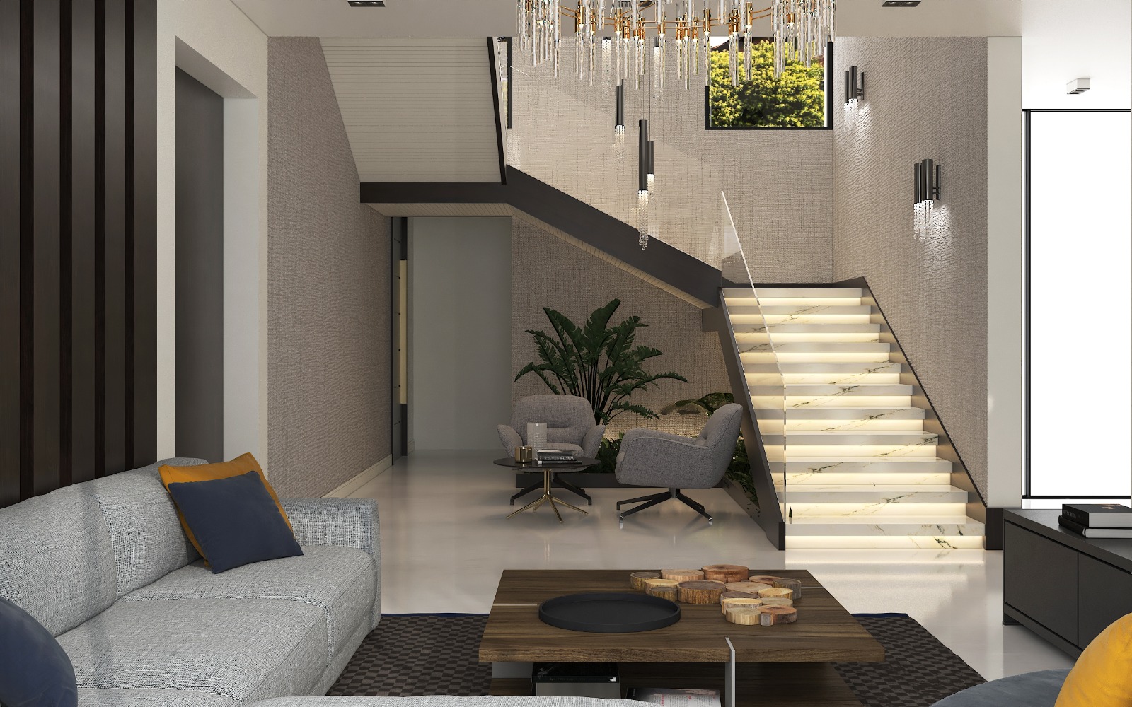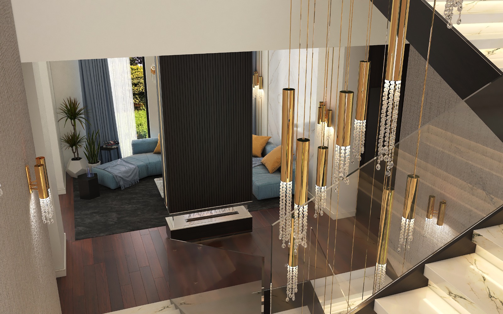 مشروع تصميم وتشطيب فيلا سكنية متكاملة بمنطقة الشيخ زايد بخامات فاخرة عالية الجودة. يشمل المشروع تأسيسات كاملة للصحي والكهرباء والتكييف، تشطيبات راقية بجبس مستورد، تجليد حوائط بألواح خشبية داكنة ورخام طبيعي بعروق ذهبية، أرضيات رخام لامع فاتح، أعمال سيكوريت، وإضاءة فاخرة من الكريستال. التصميم يعتمد على أسلوب فندقي عصري بتفاصيل معمارية دقيقة مع أثاث وفرش كامل لجميع المساحات والغرف.
