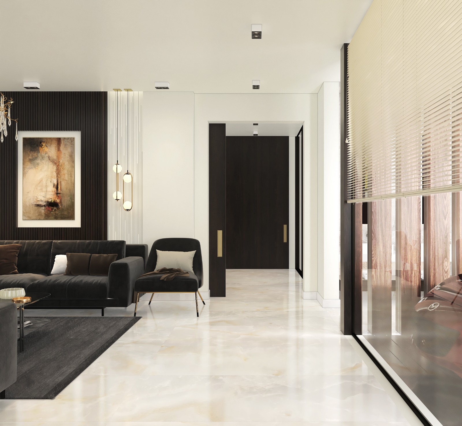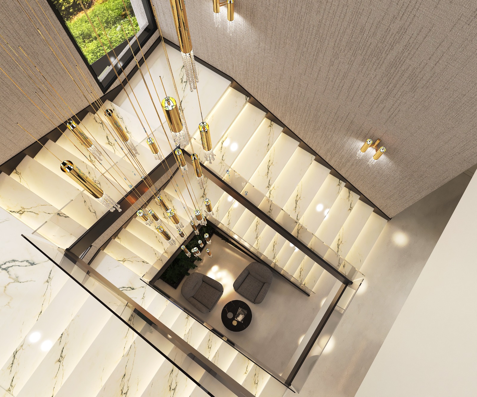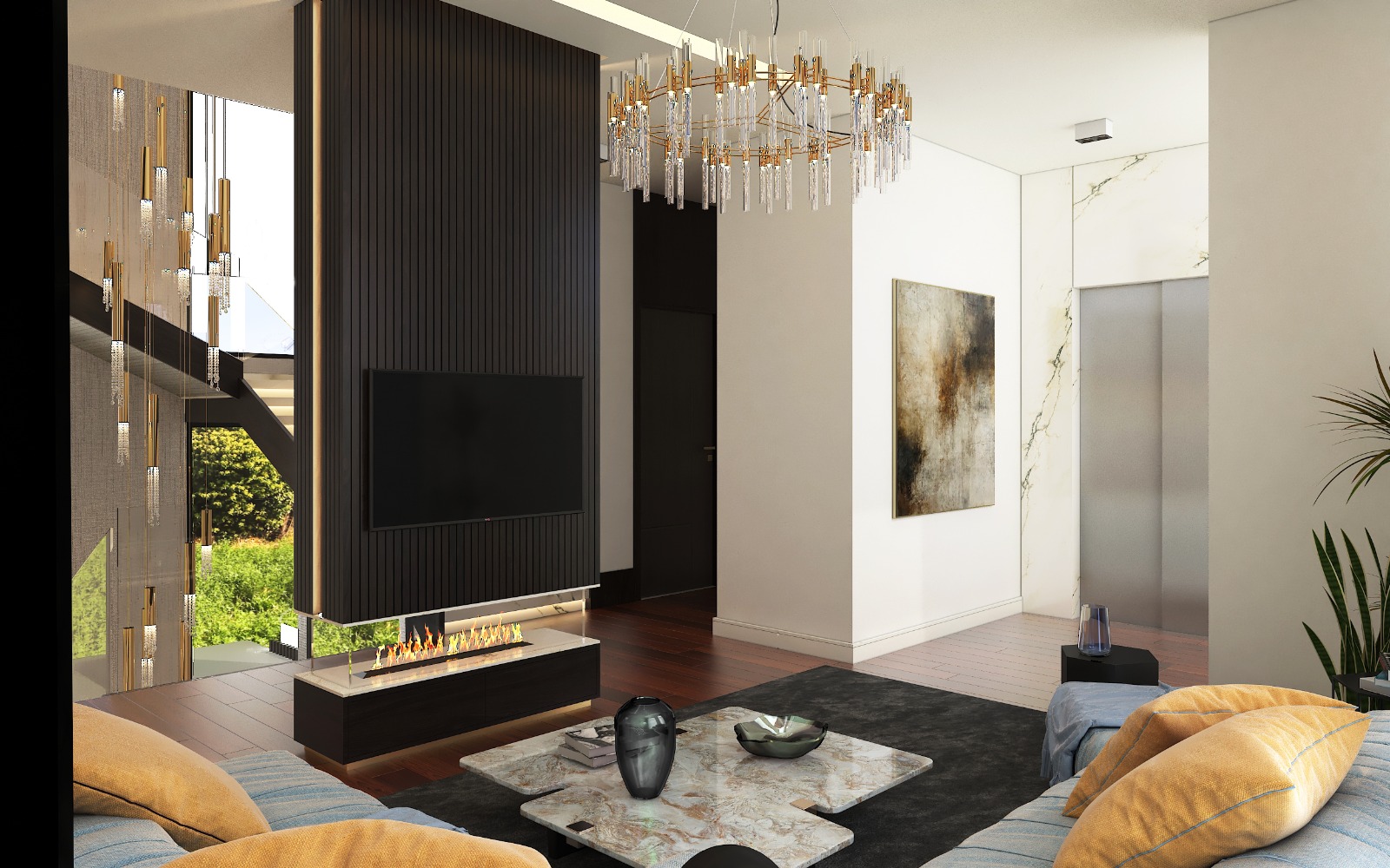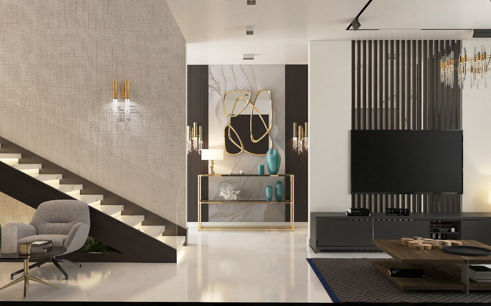 مشروع تصميم وتشطيب فيلا سكنية متكاملة بمنطقة الشيخ زايد بخامات فاخرة عالية الجودة. يشمل المشروع تأسيسات كاملة للصحي والكهرباء والتكييف، تشطيبات راقية بجبس مستورد، تجليد حوائط بألواح خشبية داكنة ورخام طبيعي بعروق ذهبية، أرضيات رخام لامع فاتح، أعمال سيكوريت، وإضاءة فاخرة من الكريستال. التصميم يعتمد على أسلوب فندقي عصري بتفاصيل معمارية دقيقة مع أثاث وفرش كامل لجميع المساحات والغرف.