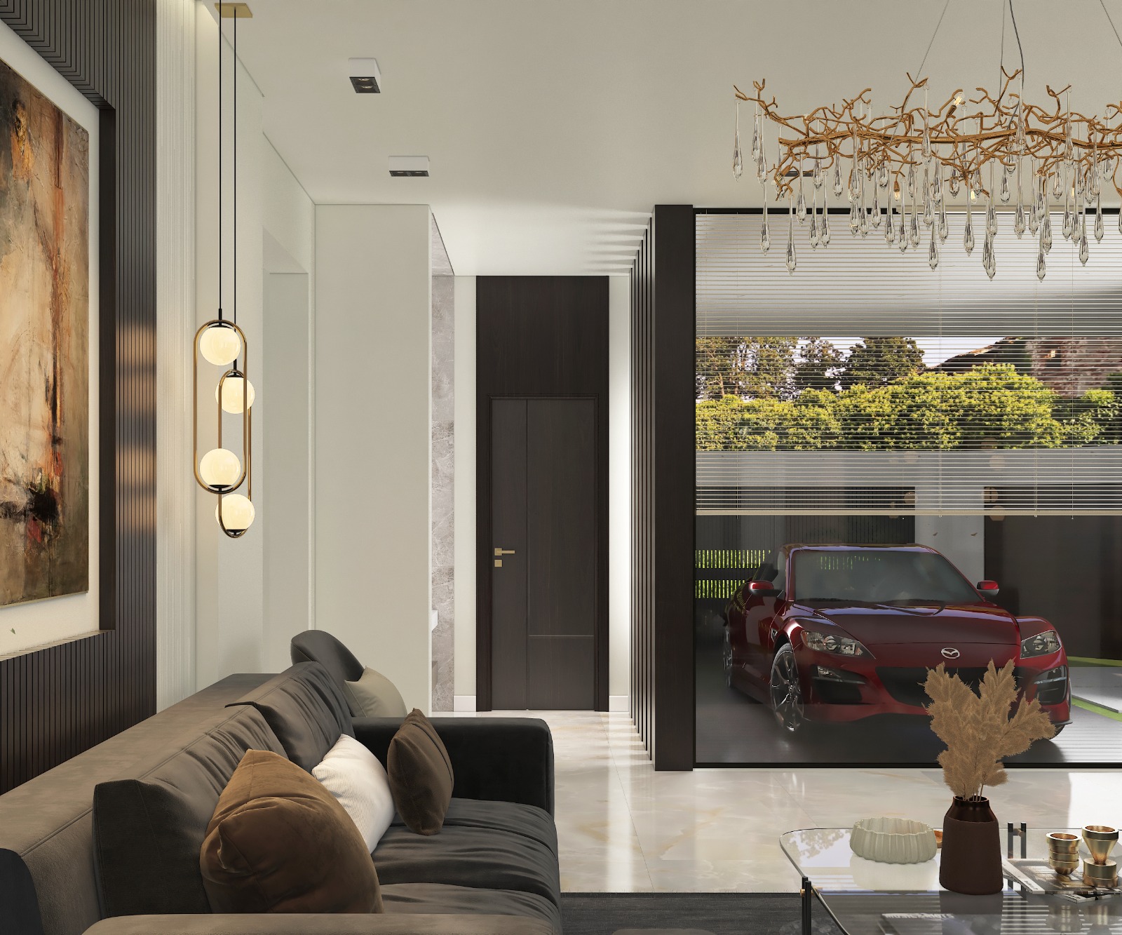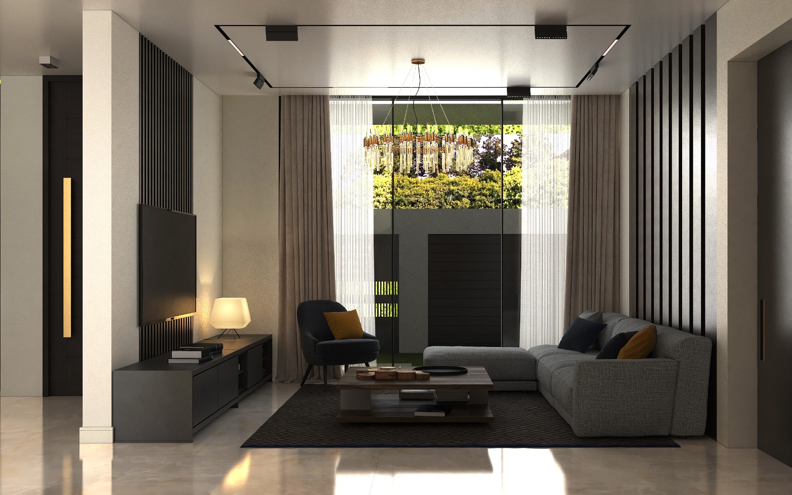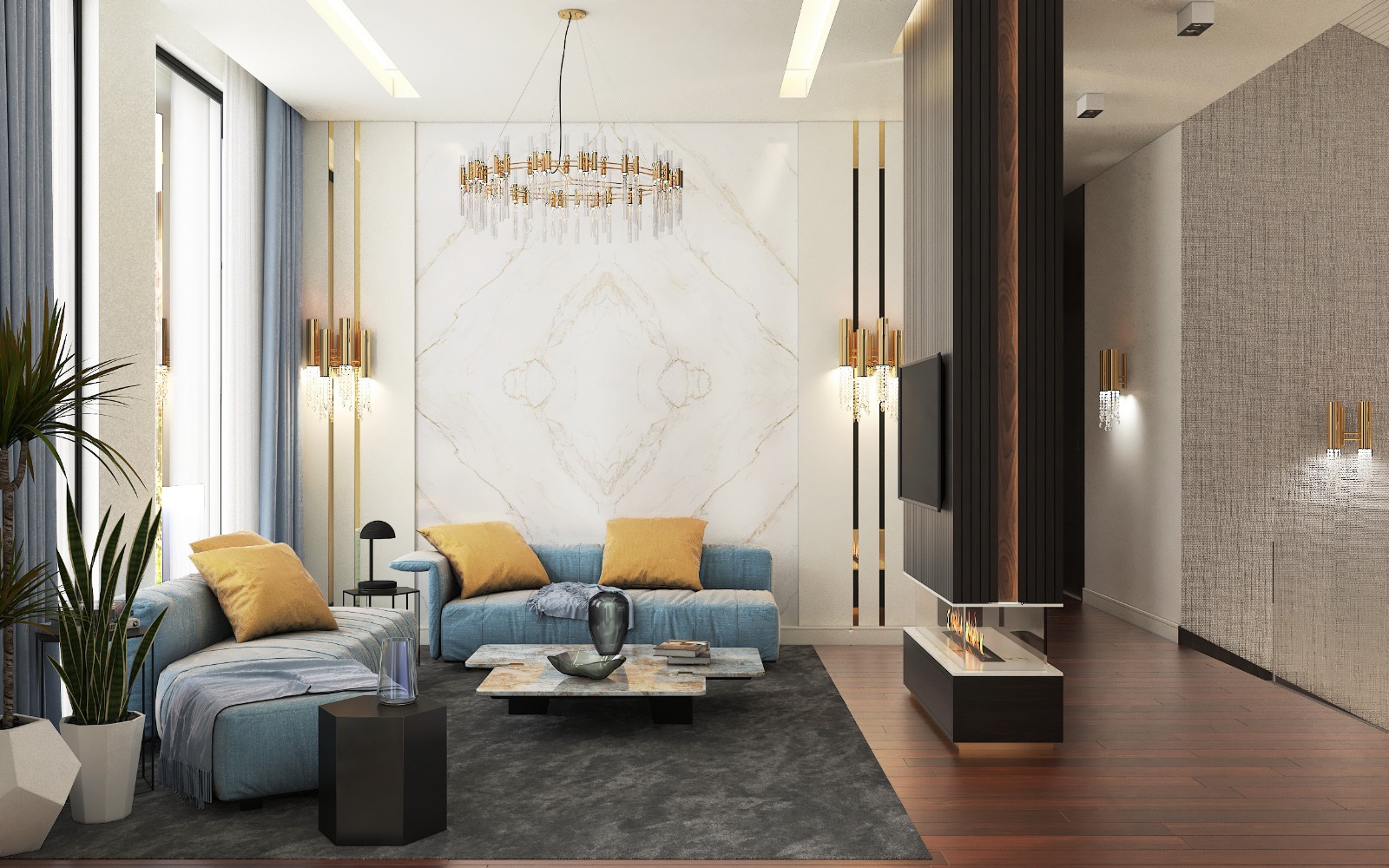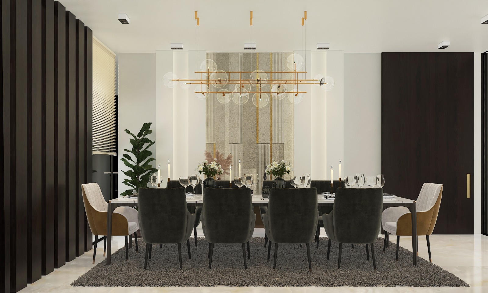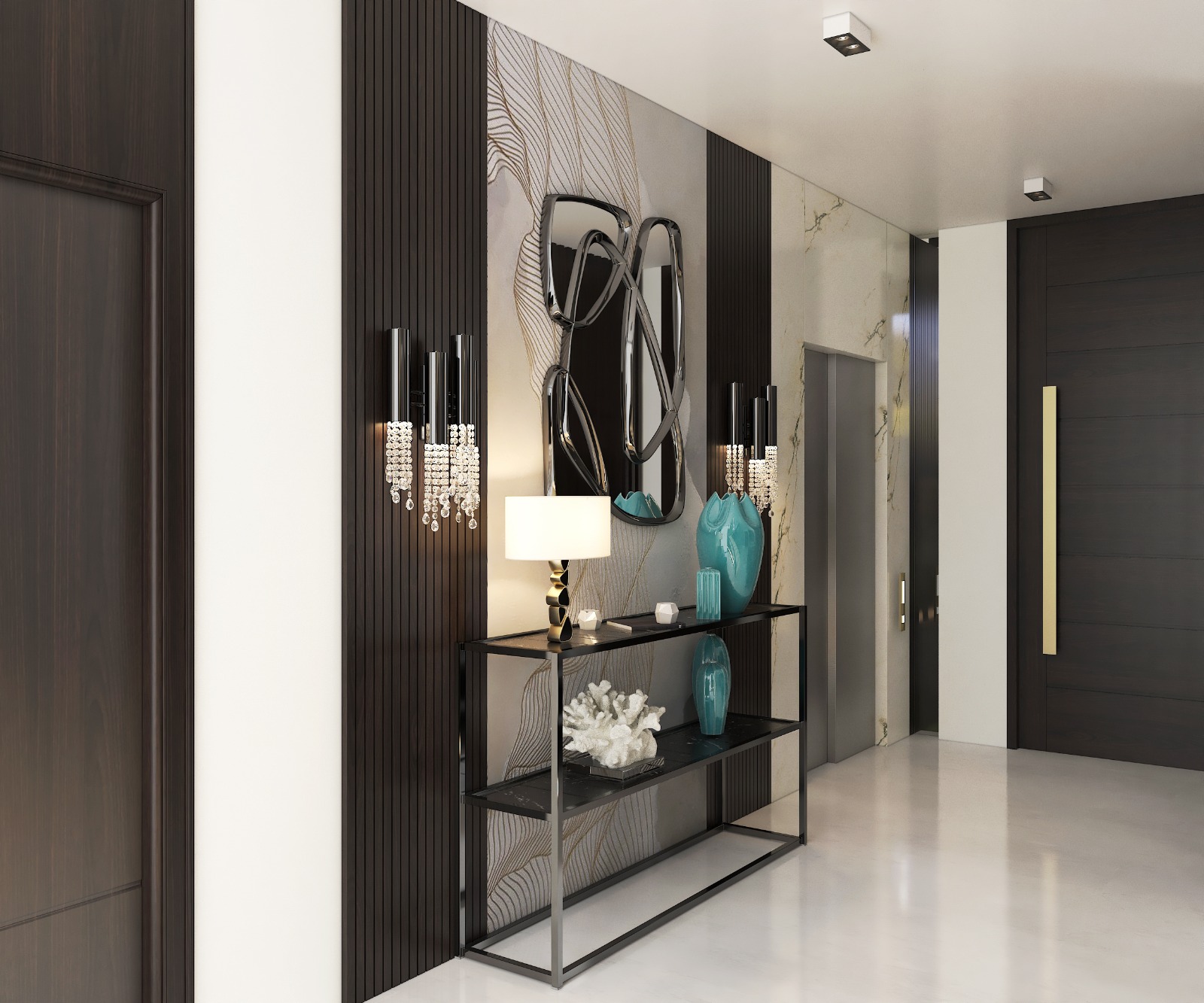 مشروع تصميم وتشطيب فيلا سكنية متكاملة بمنطقة الشيخ زايد بخامات فاخرة عالية الجودة. يشمل المشروع تأسيسات كاملة للصحي والكهرباء والتكييف، تشطيبات راقية بجبس مستورد، تجليد حوائط بألواح خشبية داكنة ورخام طبيعي بعروق ذهبية، أرضيات رخام لامع فاتح، أعمال سيكوريت، وإضاءة فاخرة من الكريستال. التصميم يعتمد على أسلوب فندقي عصري بتفاصيل معمارية دقيقة مع أثاث وفرش كامل لجميع المساحات والغرف.